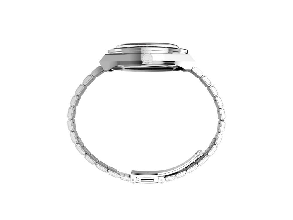 • The Timex Q Timex x NASA Apollo 17 is a men’s stainless steel watch that pays tribute to the historic 1972 space mission with a design inspired by the iconic 1970s Q Timex models. It features a silver-tone stainless steel case and bracelet, a black aluminum bezel with tachymeter scale, and a matching retro-futuristic dial. On the case back, the watch reveals the iconic “Blue Marble” image captured by the Apollo 17 astronauts. Completed with a brushed recycled stainless steel bracelet, this model combines space heritage, vintage design, and contemporary character in a unique and collectible timepiece.