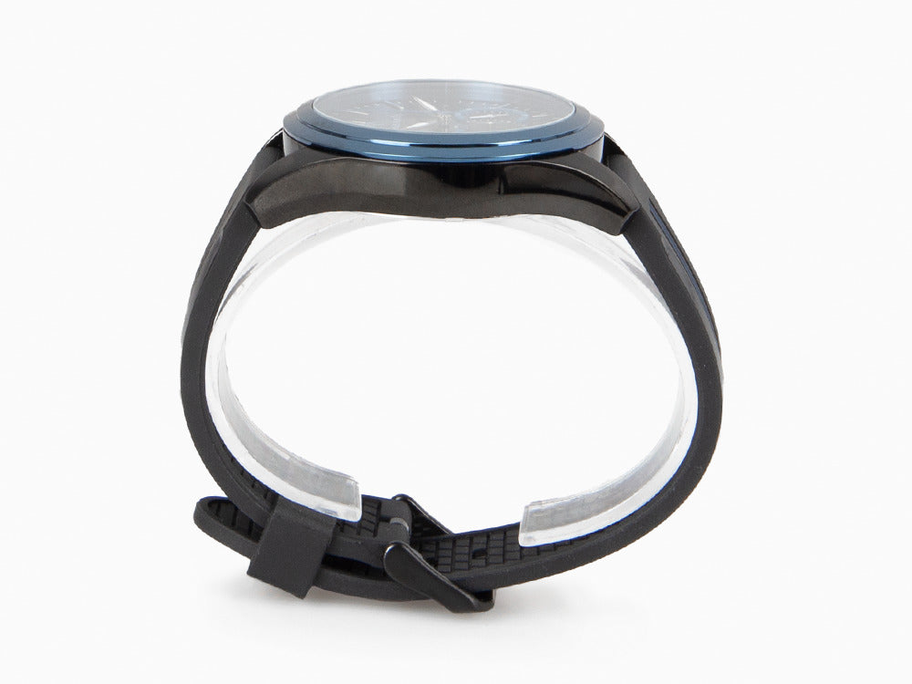 • Maserati watch for men from the Traguardo collection made of black rubber strap and blue stainless steel. Its dial is black with silver indexes and hands moved by analog quartz mechanism with chronograph protected by mineral crystal.